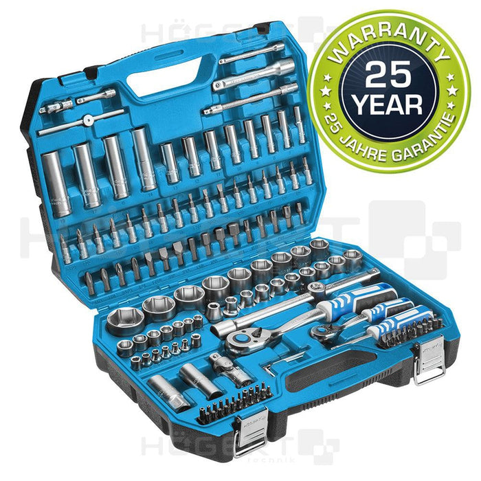 Högert set utičnica od 1/4” i 1/2”, bitova odvijača i dodataka. Set se sastoji od 144 elementa.