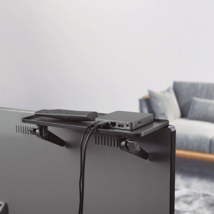 - Ova inovativna polica pruža rešenje za držanje uređaja iznad televizora, kao što su ruteri, daljinski upravljači i mnogi drugi dodaci