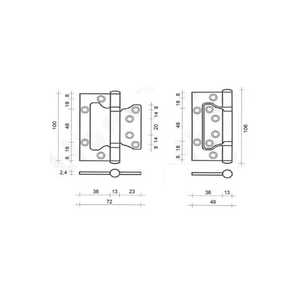 OPIS- Prolazna šarka za unutrašnja nefalcovana vrata sa uklapajućim krilima. Leptir šarka je reverzibilna i okretanjem za 180° dostupna je za leva i desna vrata. Debljina krila 2,4 mm, koliko je i zazor između krila i štoka.