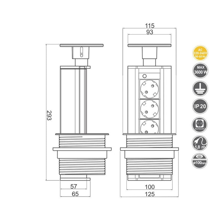 Na utičnici se nalaze 3 šuko ulaza kao i kabl 1,8m dužine sa šuko utikačem.