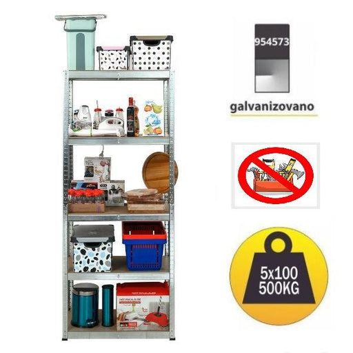 Polica ima 5 nivoa, a svaki nosi 100kg. Ukupna nosivost je 500kg. Metalni deo police čine stubici u L profilu 30x30mm sa duzinskom perforacijom. Perforacija omogućava proizvoljno podešavanje raspona izmedju nivoa police.