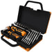 Komplet set alata TT-3100 preporučujemo za precizan rad kod kuće, u bašti ili u radionici. Kompaktan set s dobrim držanjem i fleksibilnim nastavkom, neklizavajućim odvijačima, fino obrađenim bitovima, ključevima pomoću kojih rad čini zadovoljstvo. Uređen, dobro sređen raspored u praktičnoj tvrdoj plastičnoj kutiji koja se zaključava. Žuti okvir je lako pronaći čak i pri slabom osvetljenju. Zbog svoje male veličine uklapa se u fioku , a zbog male težine (1,24 kg) možete ga poneti bilo gde sa sobom. Odličan kvalitet i dugi vek trajanja.